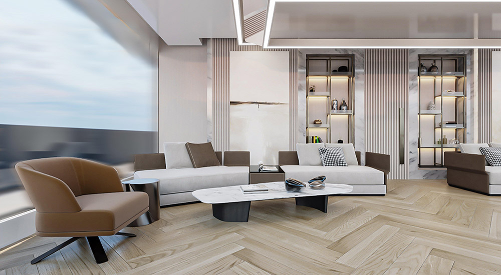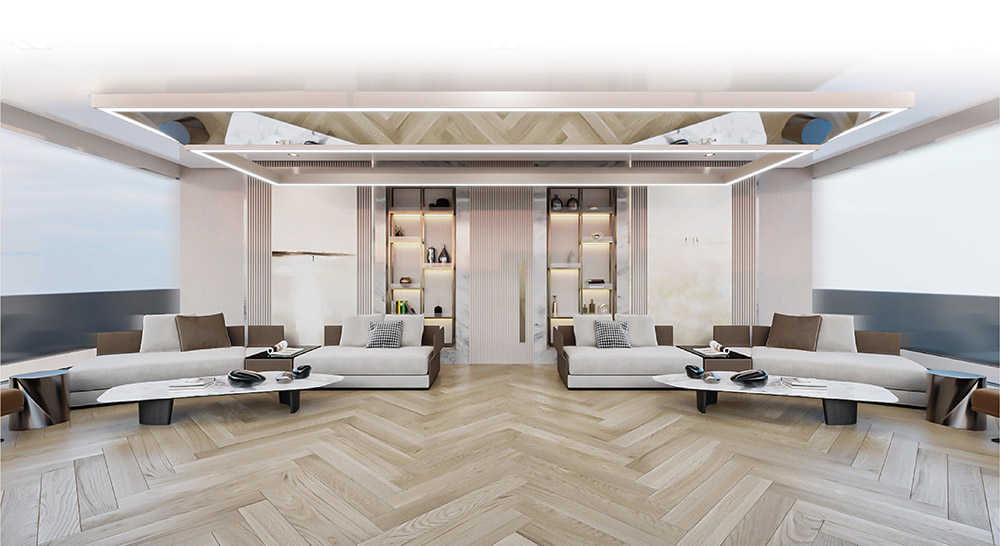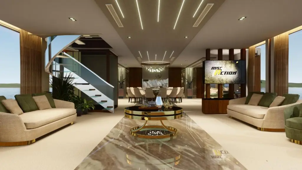 The forward salon, spanning 90 sqm, is an ideal place for relaxation, offering floor-to-ceiling windows and panoramic sea views. Two smaller lounges of 30 sqm each offer quiet, intimate settings for private conversations or moments of reflection.