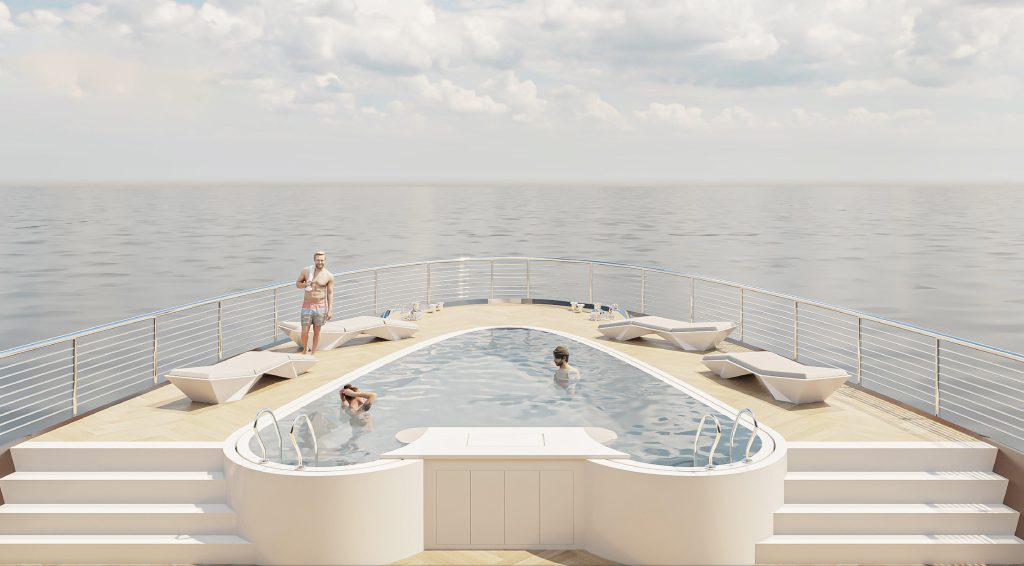 Jasmine is designed for both relaxation and adventure, offering a variety of recreational features. The beach club, located at the stern, provides direct access to the water via an aft door and side ramps—ideal for water sports or a refreshing swim. The yacht also features a heart-shaped swimming pool surrounded by a spacious sunbathing area, offering a tranquil space to unwind and take in the surroundings.