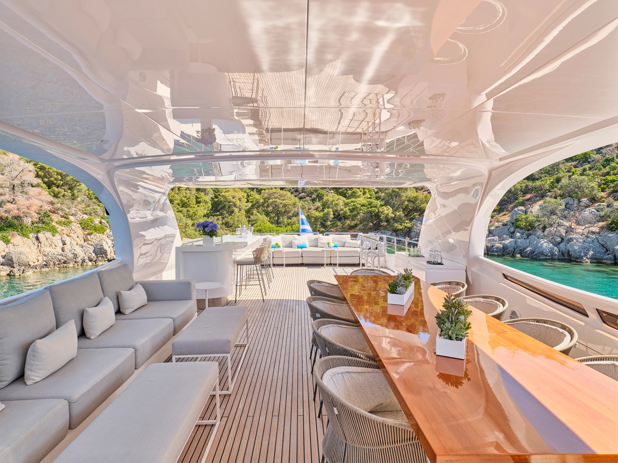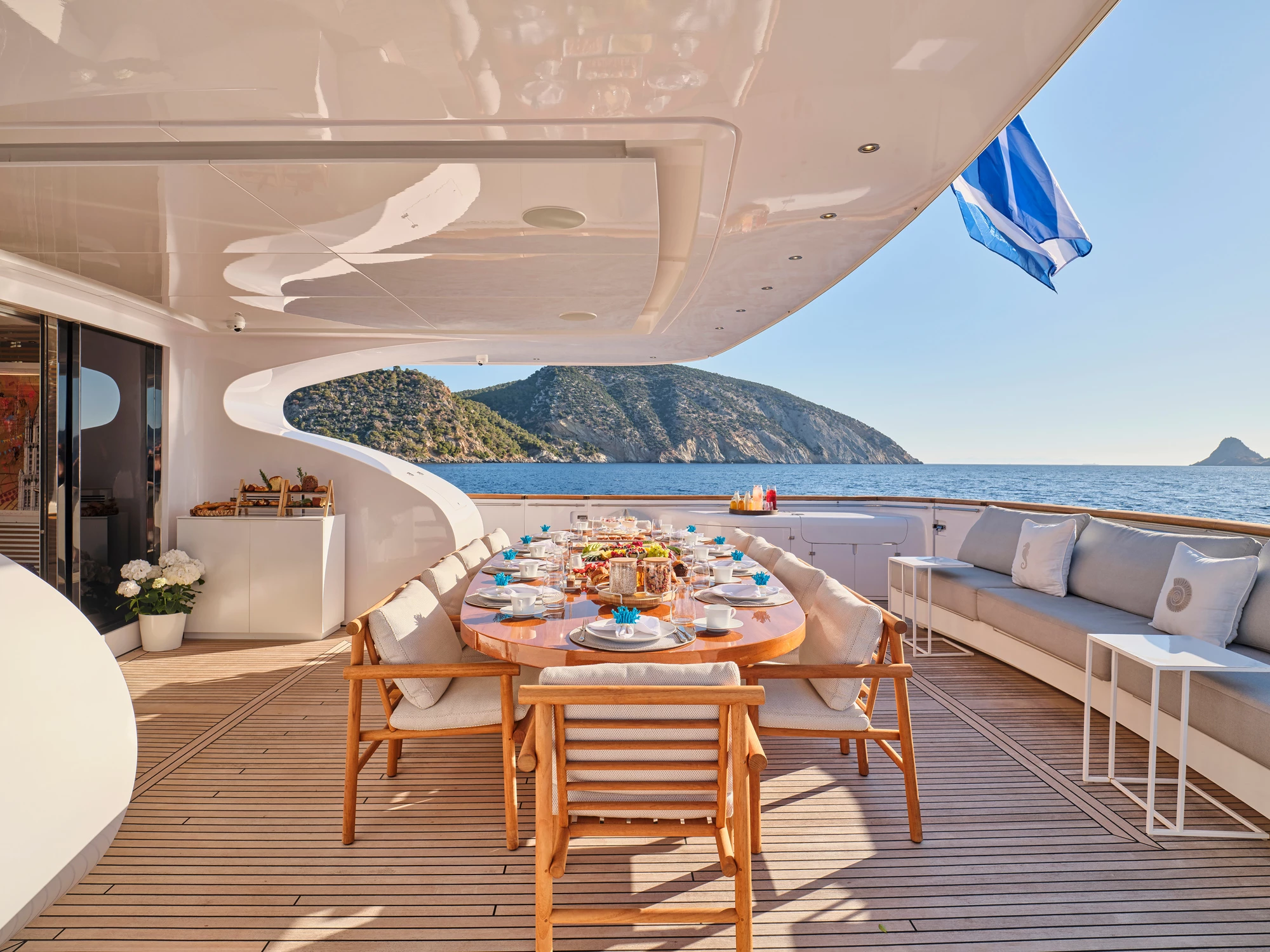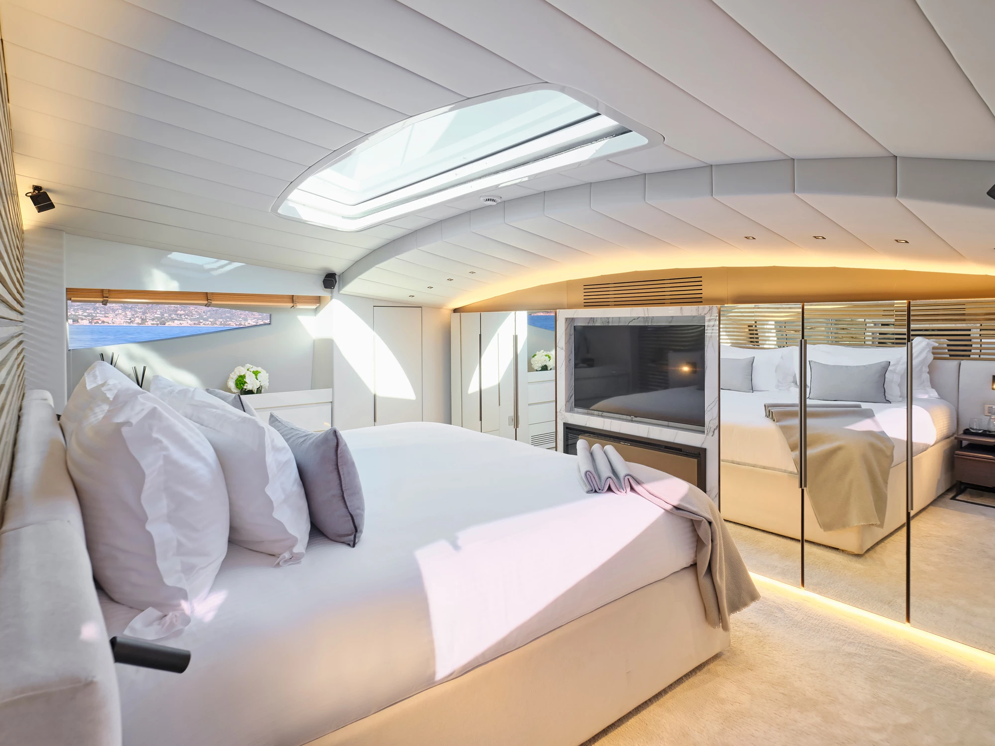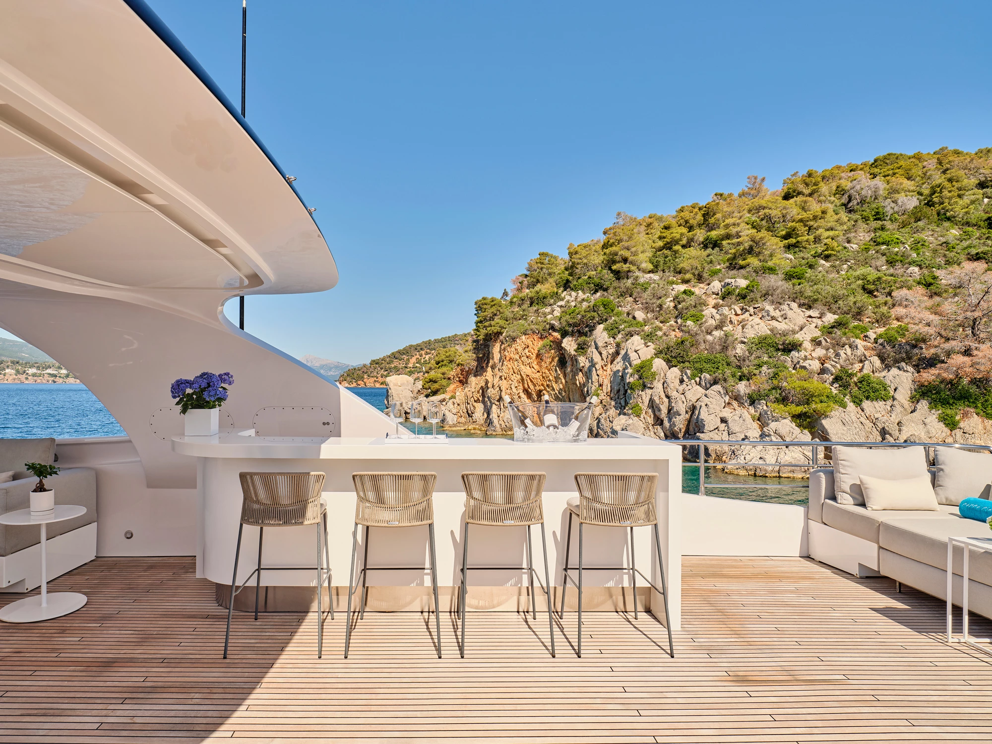 Guests can savour their time on board in a variety of outdoor settings. The sundeck, in particular, is a highlight with its wet bar, extensive sunbathing areas, and multiple al fresco dining options. Combined with a cruising speed of 16 knots and a wide array of water toys, MAMMA MIA offers something for everyone, from the adventure lover to the sun-seeker