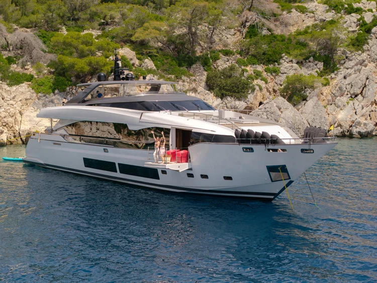 She is a breathtaking 36m Maiora yacht that offers luxurious accommodation for up to ten guests, attended by a dedicated crew. Her open-plan living spaces include a spacious saloon and dining area, seamlessly connected to a fully equipped galley and crew mess.